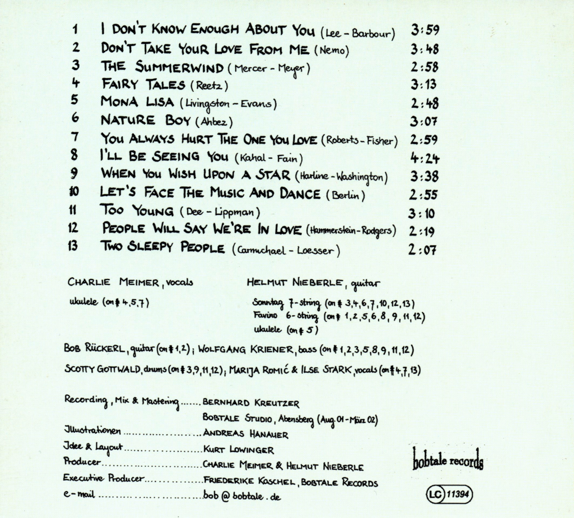 13 der schönsten Jazzballaden gesungen von einem Crooner, begleitet von Background Sängerinnen, Gitarren und Kontrabass. Mit einem 16-seitigen Booklet, das Titel und Text der Balladen in Karrikaturen augenzwinkernd realistisch kommentiert.