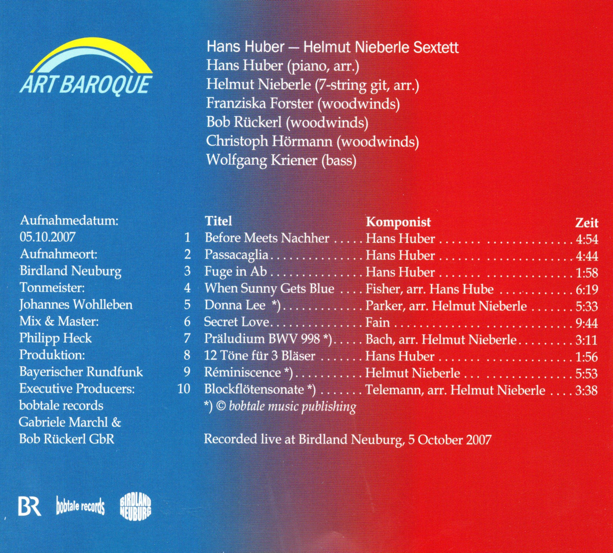 Kompositionen aus der Barockzeit, Jazzstandards und neu Komponiertes von Hans Huber und Helmut Nieberle bilden auf dieser CD eine faszinierende Einheit. Das Sextett spielt harmonisch ausgefeilte Arrangements, in denen dreistimmige Bläsersätze, Klavier, Gitarre und Kontrabass ein fugenartiges Stimmengeflecht bilden. Aufgenommen im Rahmen der Neuburger Barockkonzerte.