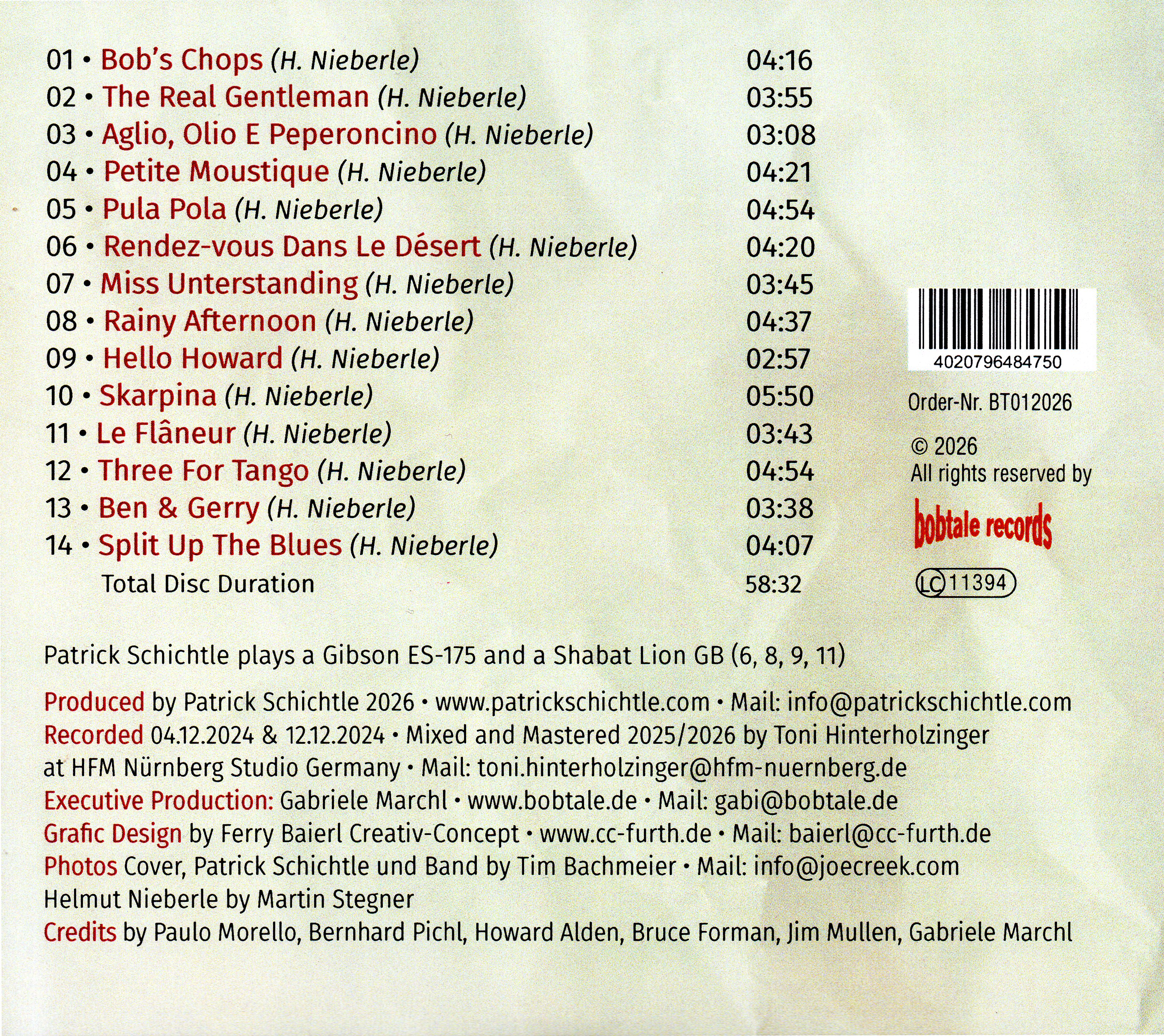 "What a treat to hear Patrck Schichtle give new life to the music of beloved guitarist / teacher / composer / mentor Helmut Nieberle! Helmut was such a generous spirit and motivating force on the community in Bavaria and beyond, ans I was always excited to come to Regensburg to play with him and his many friends, and find out what new music he had created. Patrick´s swinging and articulate guitar playing brings out the personality, humor and beauty of Helmut´s compositions, with his own personal touch. Hello Patrick!"